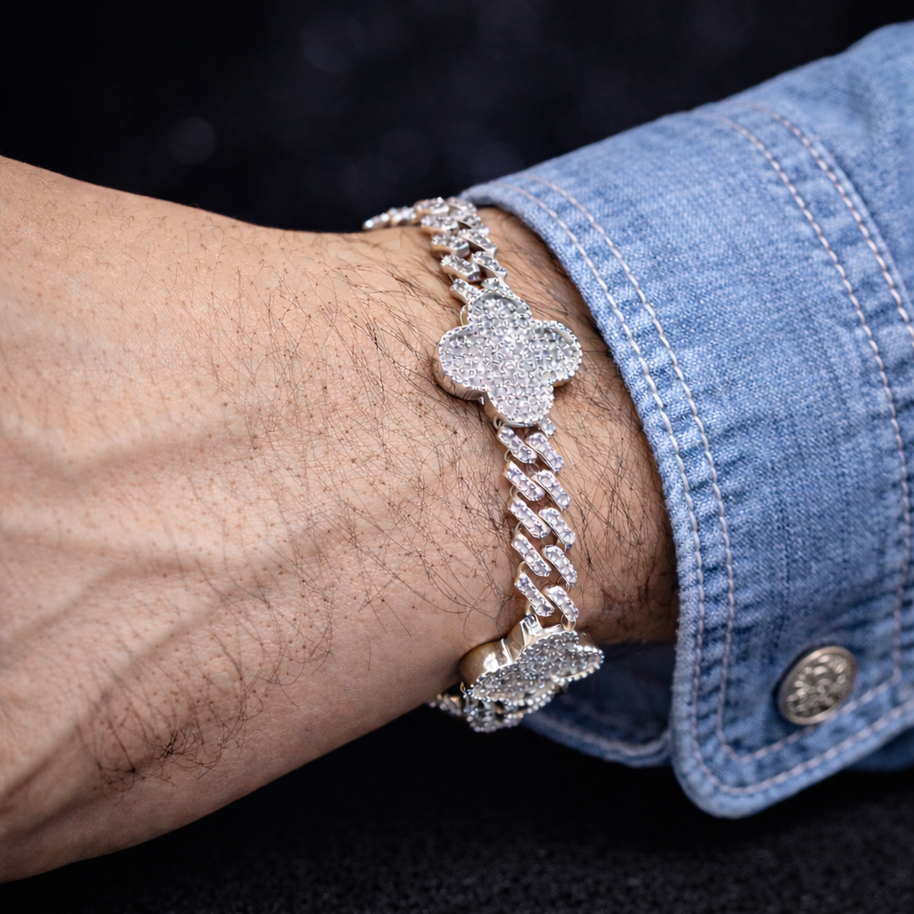 Brilla con estilo único con esta esclava cubana en plata sólida .925, decorada con detalles tipo trébol/flor totalmente pavé e incrustados con zirconias (CZ) de alta calidad. El diseño combina la fuerza de la cadena cubana con el toque elegante del brillo, creando una pieza moderna, sofisticada y con presencia.
